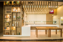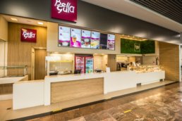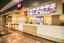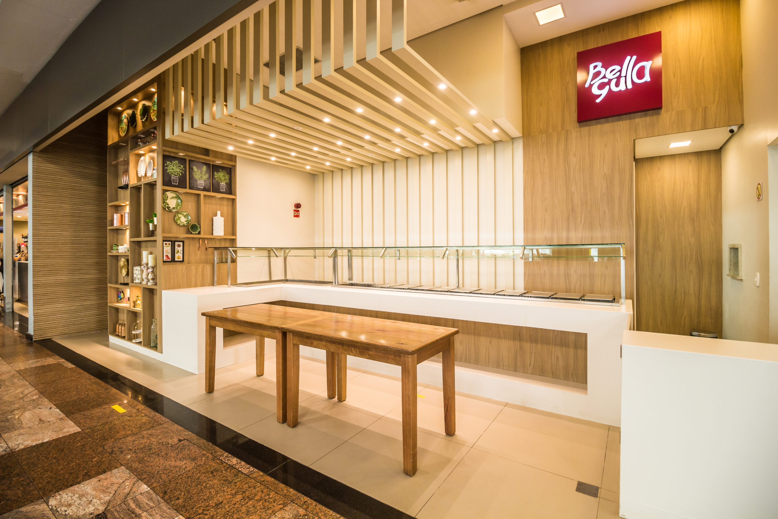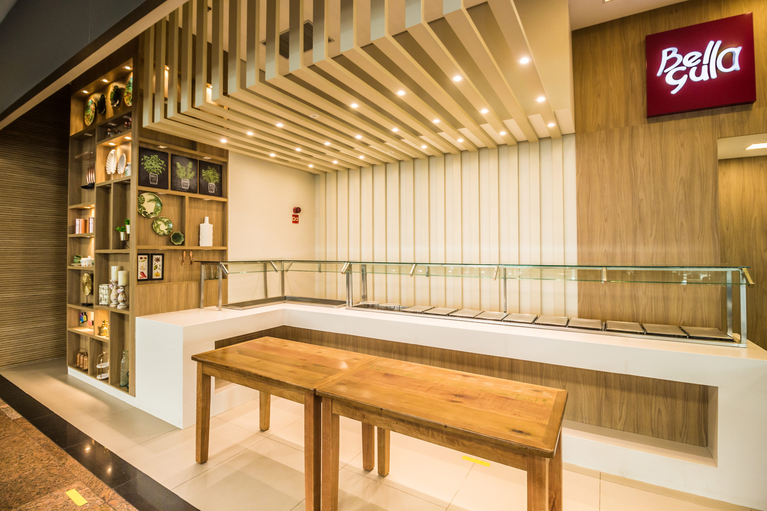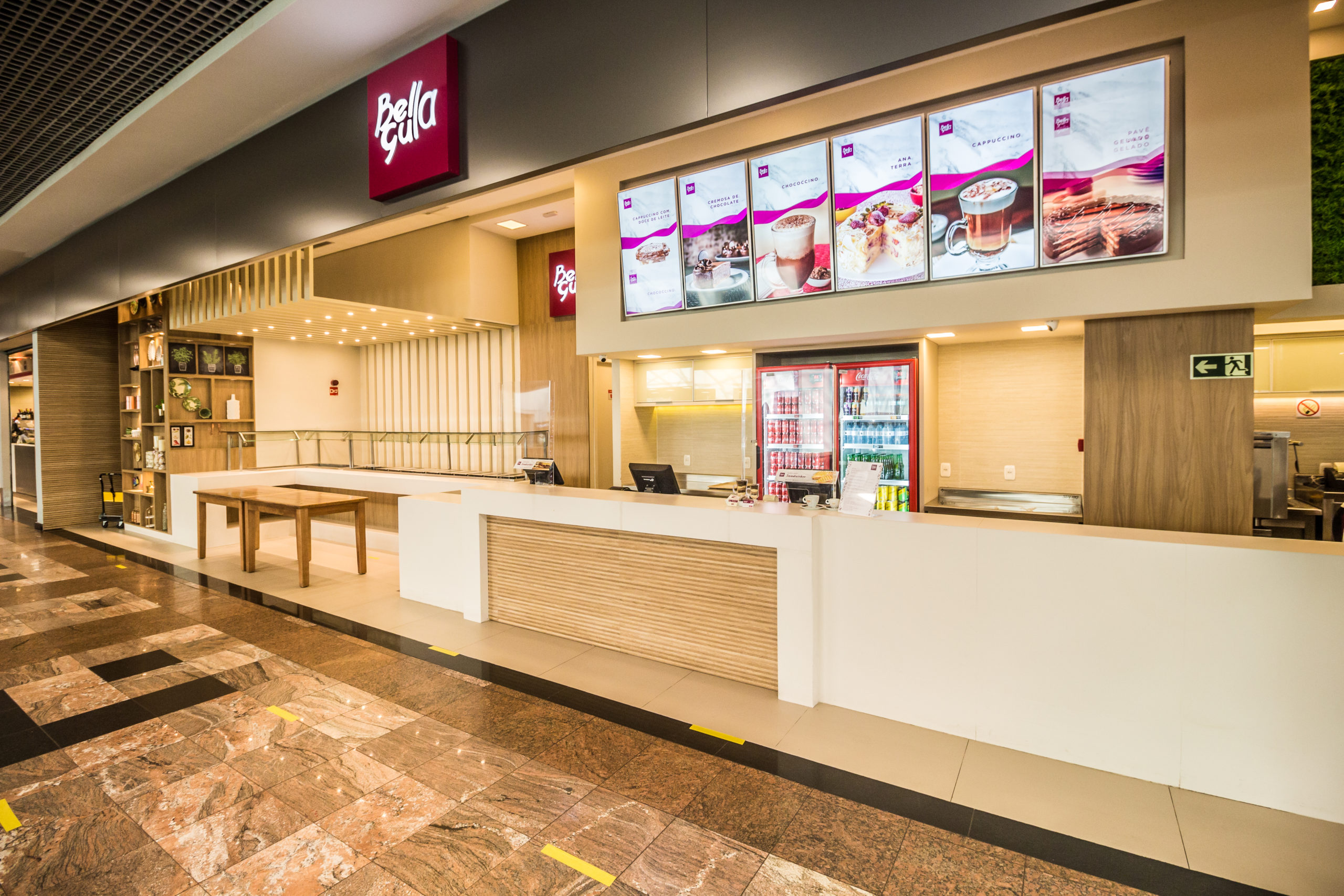 Espaço com 190m² no Aeroporto Internacional Salgado Filho, possui cozinha profissional, estoque, balcão de atendimento, buffet e elementos arquitetônicos.